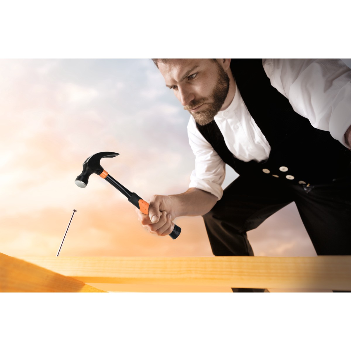 锤头采用模压锻造,经过淬硬和回火处理。带研磨锤面和高品质加工的锤爪 – 美式。双组分握柄触感柔软,符合人体工程学设计,可减少振动。