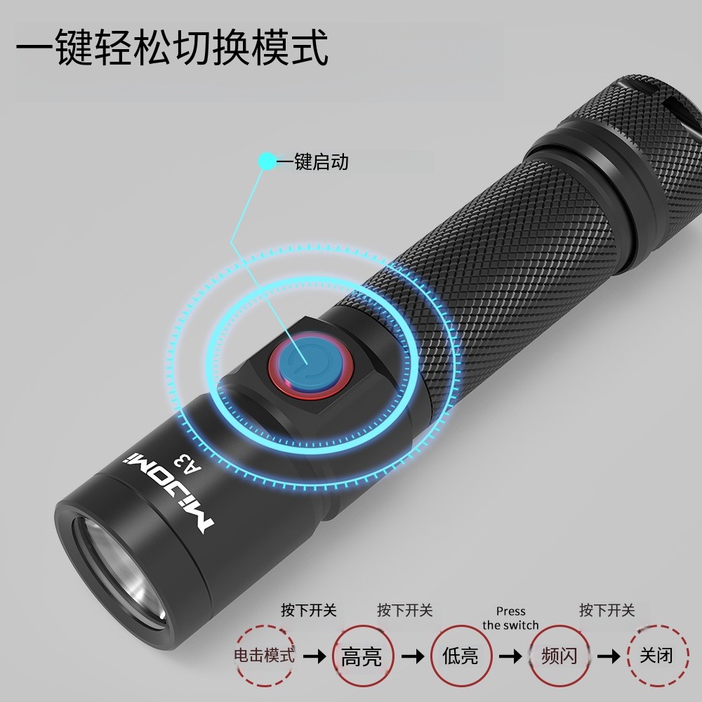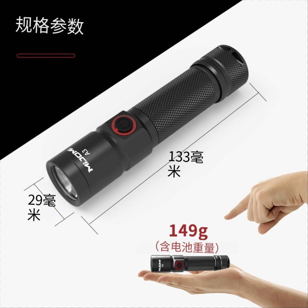商品名称:MIJOMI/麦卓米 实用型可充电手电筒A3 3W 18650锂电池/聚光300Lm 1套
