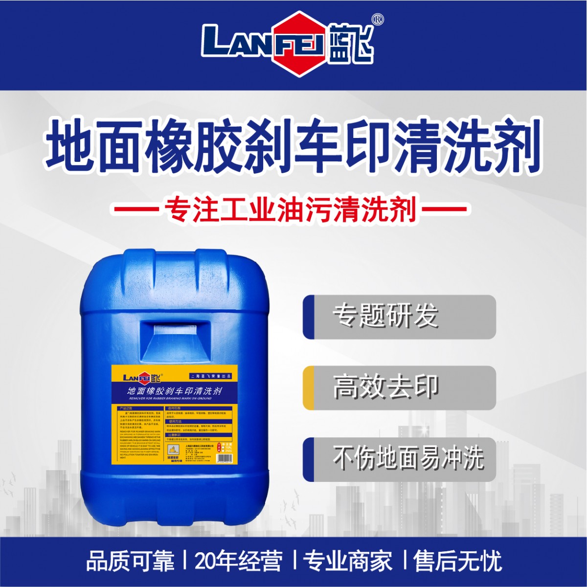 商品名称:Lanfei/蓝飞 地面橡胶刹车印清洗剂 Q038-25 25Kg 售卖规格:1桶
