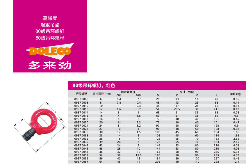 商品名称:Doleco/多来劲 80级吊环螺母 售卖规格:1个